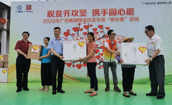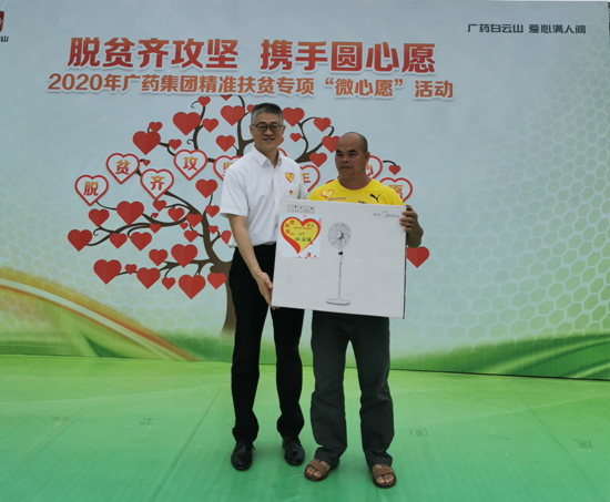 活動伊始,集團領(lǐng)導(dǎo)、各對應(yīng)扶貧企業(yè)領(lǐng)導(dǎo)、鎮(zhèn)領(lǐng)導(dǎo)以及貧困戶代表出席了主題為“脫貧齊攻堅,攜手圓心愿”的精準扶貧專項“微心愿”活動。本次“微心愿”活動得到星群公司廣大員工的積極響應(yīng),僅一天時間就有60余名集團員工及120名星群員工(集體)報名參加,為徑口村60名貧困戶獻上濃濃的愛心?;顒蝇F(xiàn)場,楊軍總經(jīng)理為徑口村貧困戶代表林國強送上了他的小心愿電風(fēng)扇一臺?;糁境蓵浺矠樨毨舸韯⒍账蜕纤奈⑿脑肝镔Y。駐村干部王卡和團委書記李霖珠在現(xiàn)場被授予“廣藥愛心傳遞大使”綬帶。