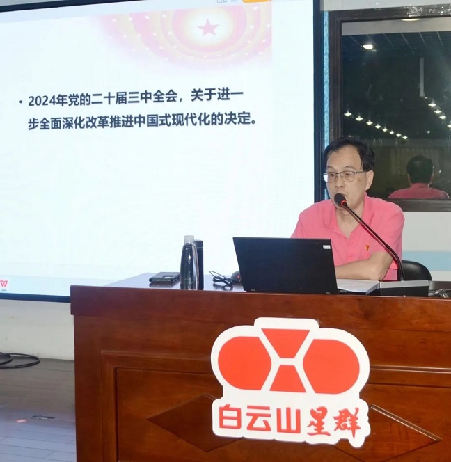廣州市國(guó)防教育講師團(tuán)成員、廣藥黨??妥淌卩u建華 胡文新書記在專題學(xué)習(xí)會(huì)小結(jié)時(shí)指出,黨的二十屆三中全會(huì)擘畫了進(jìn)一步全面深化改革的時(shí)代藍(lán)圖,具有繼往開來(lái)的里程碑意義,開啟了新時(shí)代進(jìn)一步全面深化改革、不斷開辟中國(guó)式現(xiàn)代化廣闊前景的新征程。他要求星群廣大黨員干部繼續(xù)深入學(xué)習(xí)貫徹黨的二十屆三中全會(huì)精神,以國(guó)資、國(guó)企深化改革為契機(jī),加快培育和發(fā)展新質(zhì)生產(chǎn)力,進(jìn)一步推動(dòng)星群高質(zhì)量發(fā)展上新臺(tái)階。