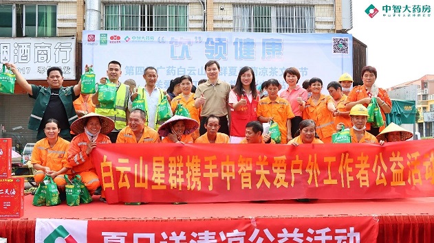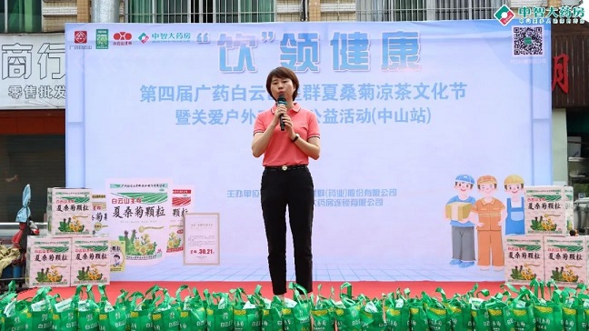 白云山星群公司總經(jīng)理賀慶在臺(tái)上致辭:"涼茶作為中國(guó)傳統(tǒng)文化的一部分,在炎炎夏日,一杯涼茶不僅能消暑解渴,更能帶來心靈的慰藉。我們白云山星群藥業(yè)將通過舉辦涼茶文化節(jié)的形式,向廣大市民普及涼茶知識(shí),推廣健康生活方式,同時(shí)也讓戶外工作者們感受到社會(huì)的溫暖與關(guān)懷。白云山星群夏桑菊在涼茶類產(chǎn)品是產(chǎn)品的領(lǐng)導(dǎo)者,占有絕對(duì)的市場(chǎng)份額,白云山星群和中山中智在業(yè)務(wù)上保持著強(qiáng)勁的戰(zhàn)略合作伙伴關(guān)系,我們也希望能為廣大消費(fèi)者提供更齊全、更專業(yè)的藥品服務(wù)。關(guān)愛環(huán)衛(wèi)工人,白云山星群藥業(yè)一直在行動(dòng),今后,我們也會(huì)聯(lián)合更多的連鎖共同開展系列公益活動(dòng),為共建和諧美好的社會(huì)盡一份力量!”