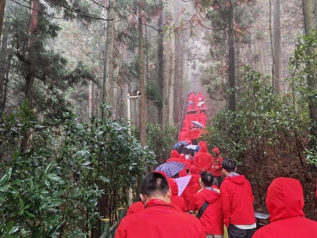在黃洋界,星群學(xué)員們冒著漫天風(fēng)飛雨霧,身臨當(dāng)年的戰(zhàn)地工事天險(xiǎn),并登頂黃洋界哨口。面對(duì)朱德同志手書“黃洋界保衛(wèi)戰(zhàn)勝利紀(jì)念碑”,品讀毛澤東詞《西江月·井岡山》的鐫刻圖雕,感嘆“敵軍圍困萬千重,我自巋然不動(dòng)”的英雄氣概!