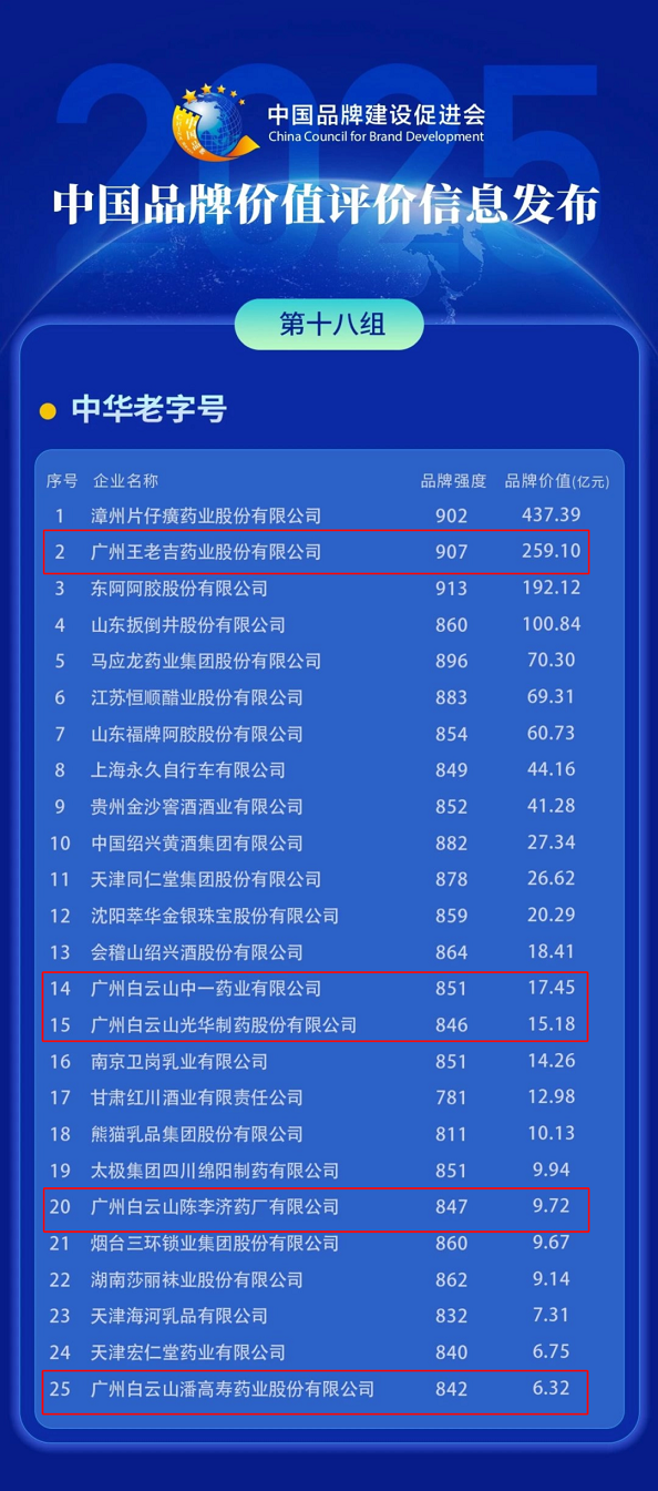 作為世界500強企業(yè)廣藥集團旗下上市公司,廣藥白云山擁有13家中華老字號,其中11家已超百年歷史。在活動現(xiàn)場,2025中國品牌價值評價信息中華老字號品牌榜單同步發(fā)布。其中,廣藥白云山旗下王老吉藥業(yè)、白云山中一、白云山光華、白云山陳李濟、白云山潘高壽榮登中華老字號品牌榜,進入榜單25強。
