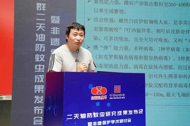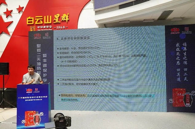 毛潤乾團隊成員陳大嵩博士為與會嘉賓重點講解了《二天油防蚊叮咬成果報告》,毛潤乾團隊實驗研究顯示,在二天油室內驅蚊藥效試驗中,星群嚴格參照國標GB/T 13917.9-2009測試,證明在涂抹1.5µl/cm²星群二天油,能對傳播基孔肯雅熱與登革熱的“元兇”——白紋伊蚊形成長達6小時的強力驅避;而依據國標GB/T 13917.6-2009測試,星群二天油對白紋伊蚊的致死率高達100%,KT50值(擊倒半數蚊蟲時間)僅需6.98分鐘。此外,參照國標GB/T 31711-2015測試,星群二天油實現48小時內殺滅90%以上的幼蟲,僅需0.025%的低濃度。