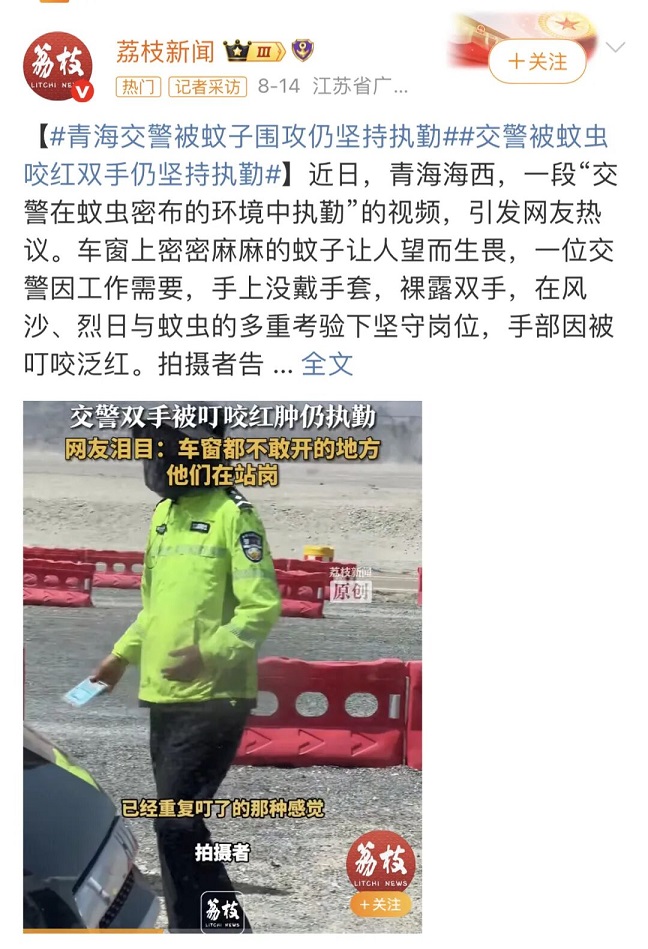 8 月中旬,一則關(guān)于青海交警執(zhí)勤時(shí)身上叮滿蚊子的新聞在網(wǎng)絡(luò)上引起熱議:畫面中,交警身著制服堅(jiān)守崗位,密密麻麻的蚊子叮滿衣服,他們只能不停抖動(dòng)將衣服上的蚊子抖落。哪怕雙手被蚊子叮咬紅腫,仍然堅(jiān)持執(zhí)勤,從不懈怠。這一幕讓無(wú)數(shù)網(wǎng)友心疼不已,也讓更多人關(guān)注到高原地區(qū)公安民輔警的艱辛日常。盡管當(dāng)前蚊蟲(chóng)高峰期已過(guò),但在海西州這片廣袤的土地上,公安民輔警 “戰(zhàn)風(fēng)沙、斗烈日、抗蚊蟲(chóng)” 的堅(jiān)守從未停歇 —— 他們頂風(fēng)冒雪堅(jiān)守路口疏導(dǎo)交通,頂著烈日在平直路段維護(hù)秩序,提醒游客避免疲勞駕駛,在蚊蟲(chóng)密布的野外開(kāi)展巡邏防控,用日復(fù)一日的執(zhí)著,筑起守護(hù)群眾平安的堅(jiān)固防線。